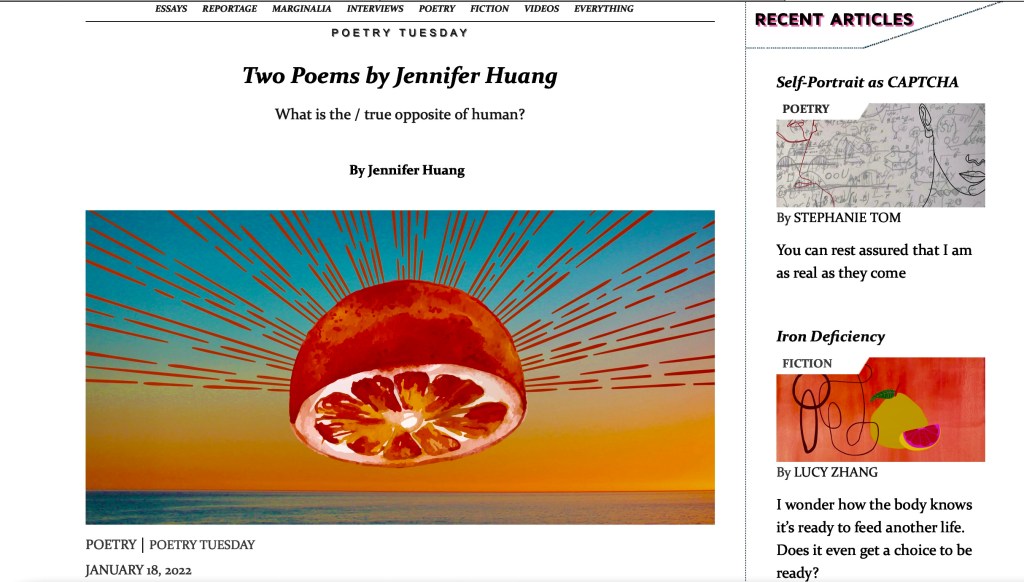 The Margins offers a regular Poetry Tuesday section featuring, you guessed it, new poetry. One of my all time Poetry Tuesday favorites is “Two Poems” by Jennifer Huang.