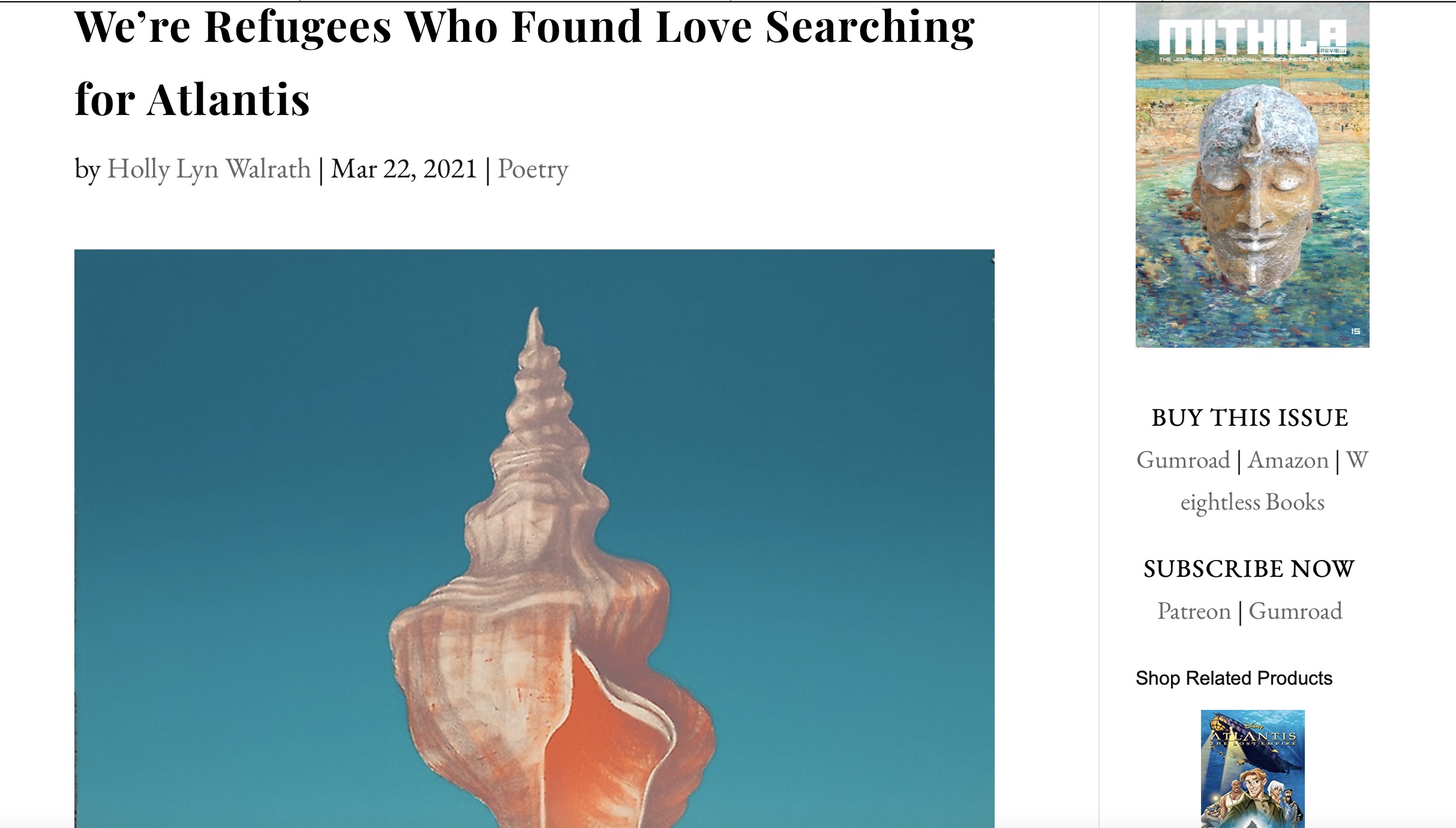 Each poem in Mithila Review is accompanied by gorgeous artwork, and most include a recording of the author reading. One of my recent favorites is “We’re Refugees Who Found Love Searching For Atlantis.” Bonus: there are two versions of the same poem.