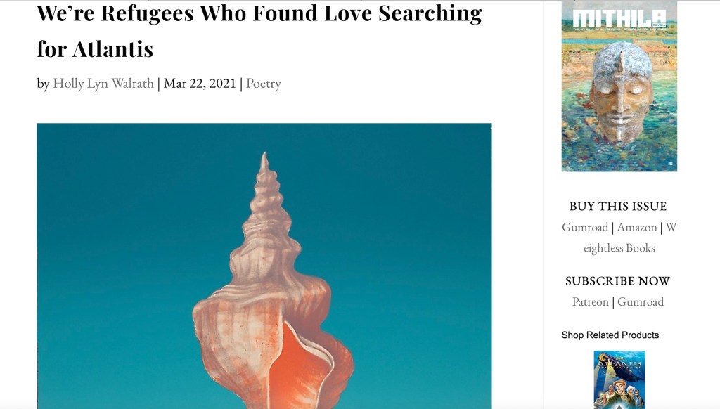 Poet Holly Lyn Walrath, writing in English, uses pantoum form to explore the drift dream of displacement, and there’s also an Italian translation “Siamo profughi che hanno trovato l’amore ricercando Atlantide” created by the late Marco Raimondo. You can read more about the collaboration between Holly Lyn Walrath and Marco Raimondo on her blog post titled:“New Poem Up at Mithila Review.”